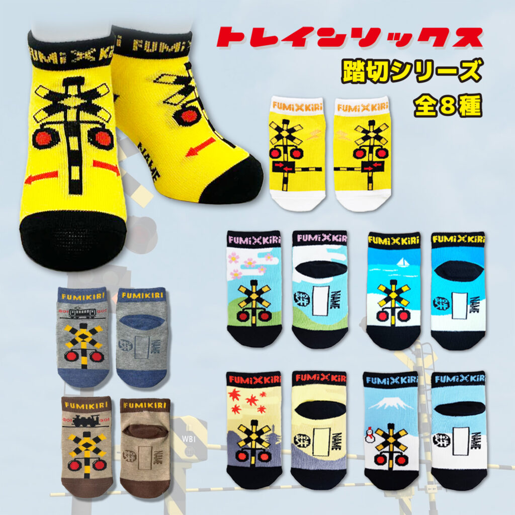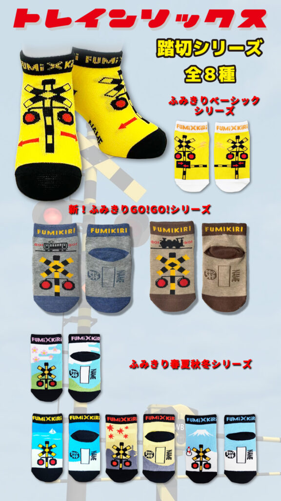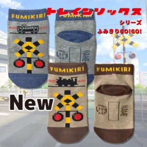 - ふみきりGO!GO!:ペールカラーを演出する杢糸を使用し、どんなファッションにも合わせやすい淡くて可愛く、そしてわかりやすいデザインに仕上げました。しかもこれまでの踏切デザインとはペールカラーに併せ、少し修正を加えています!!