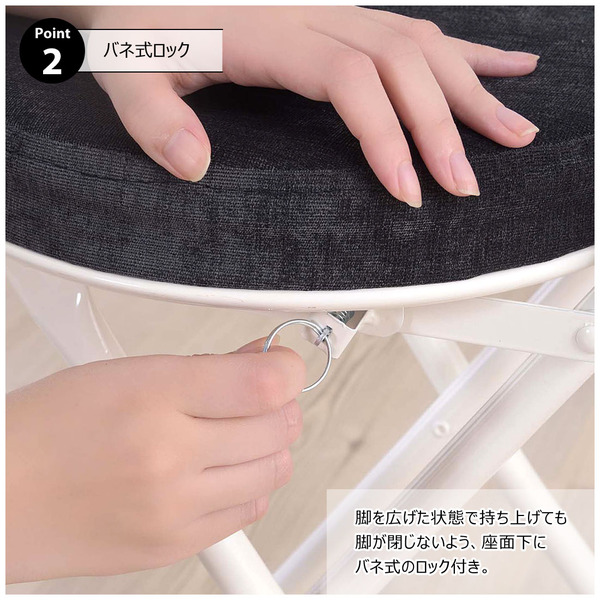 脚を広げた状態で持ち上げても脚が閉じないよう、座面下にバネ式のロック付き