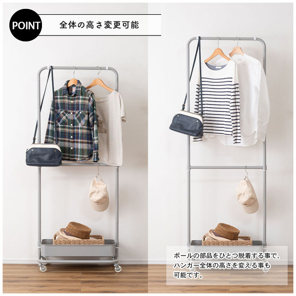 ポールの部品をひとつ脱着する事で、ハンガー全体の高さ調整も可能